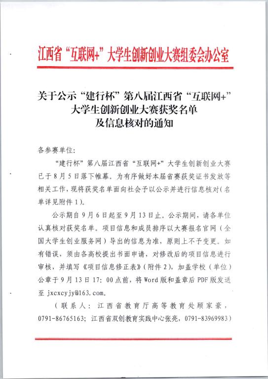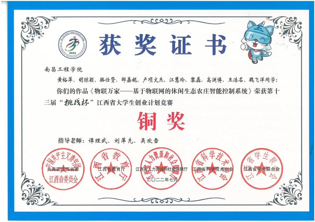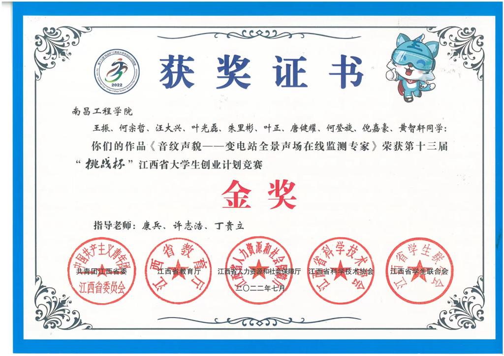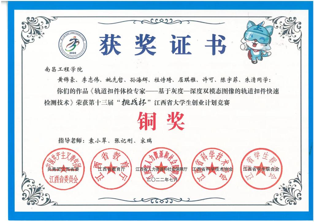 在第十三届“挑战杯”江西省大学生创业计划竞赛中,康兵、许志浩、丁贵立指导学生团队的参赛作品《音纹声貌——变电站全景声场在线监测专家》荣获江西省金奖;谭理武等指导学生团队的参赛作品《物联万家——基于物联网的休闲生态农庄智能控制系统》荣获江西省铜奖;袁小翠等指导学生团队的参赛作品《轨道扣件体检专家——基于灰度-深度双模态图像的轨道扣件快速检测技术》荣获江西省铜奖。