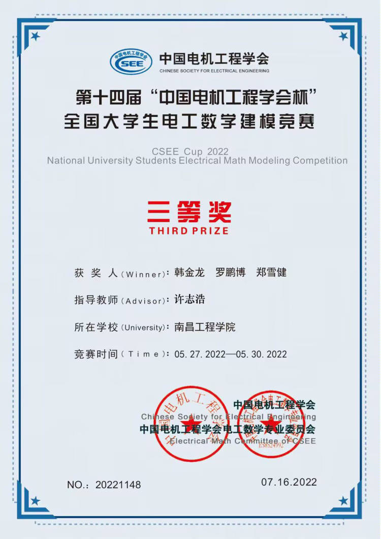 在第十四届“中国电机工程学会杯”全国大学生电工数学建模竞赛中,袁小翠指导学生团队荣获二等奖、许志浩指导学生团队荣获三等奖。