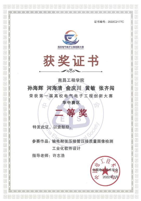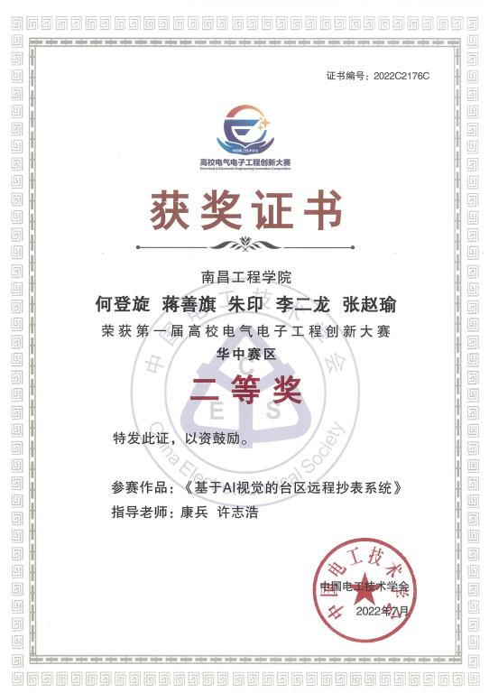 在第一届高校电气电子工程创新大赛中,康兵、许志浩指导学生参赛作品《基于AI视觉的台区远程抄表系统》荣获华中赛区二等奖,许志浩所带领学生团队的参赛作品《输电耐张压接质量图像检测工业化软件设计》荣获华中赛区二等奖,丁贵立所带领学生团队的参赛作品《风电叶片缺陷红外热像智能检测装置研发》荣获华中赛区三等奖。