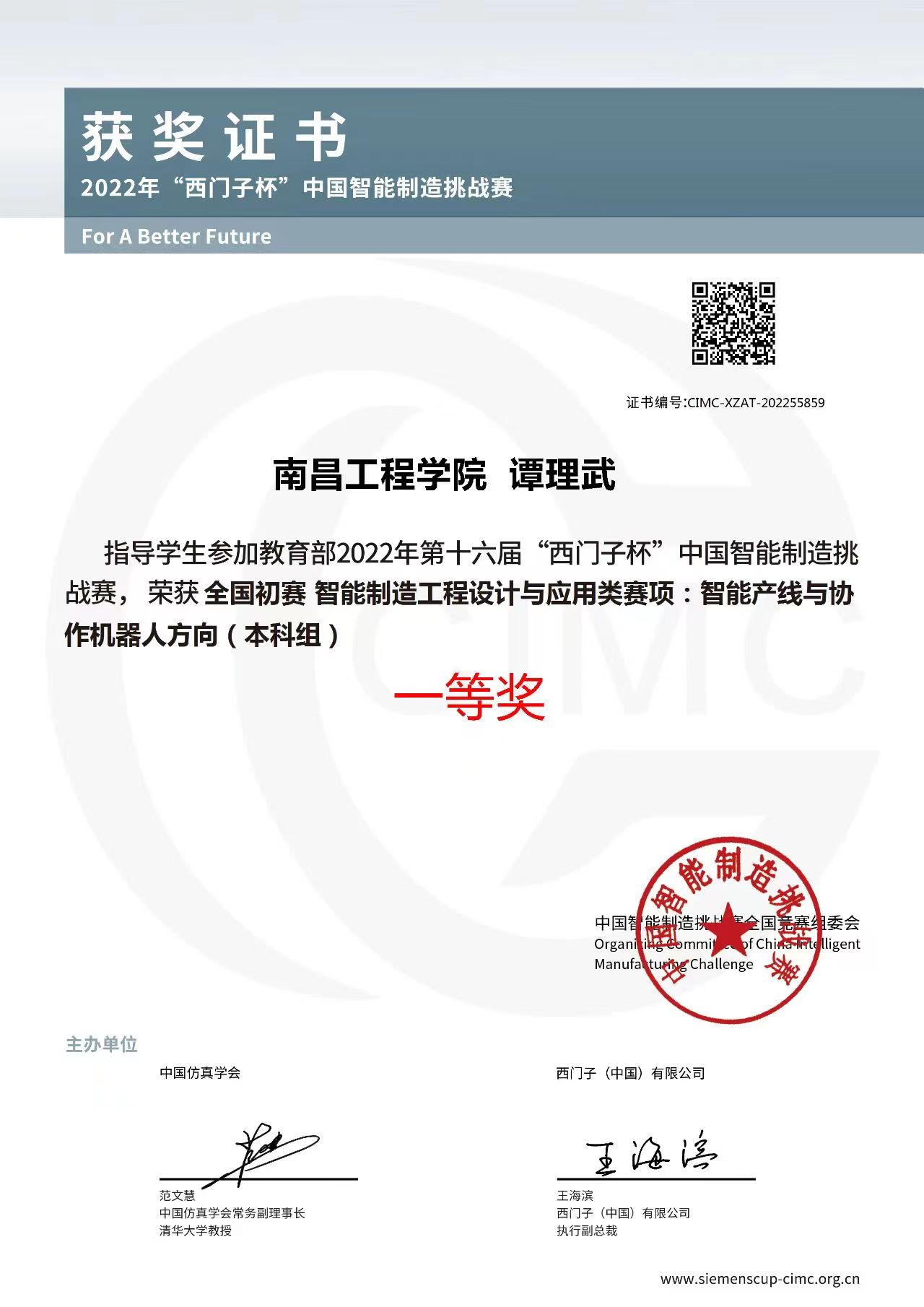 在2022年“西门子杯”中国智能制造挑战赛中,谭理武指导学生荣获智能制造工程设计与应用类赛项智能产线与协助机器人方向(本科组)一等奖。